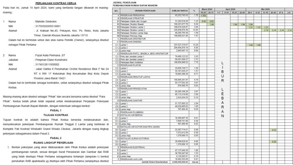 - Klien melakukan pembayaran sesuai dokumen kontrak, lalu pembayaran termin selanjutnya sesuai progres konstruksi.